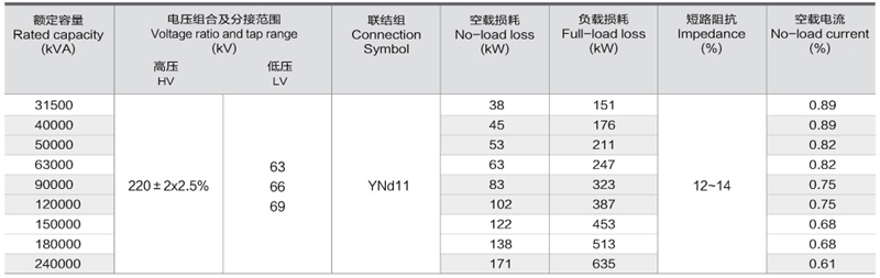 華信220kV雙繞組無勵磁調壓電力變壓器技術參數(shù):