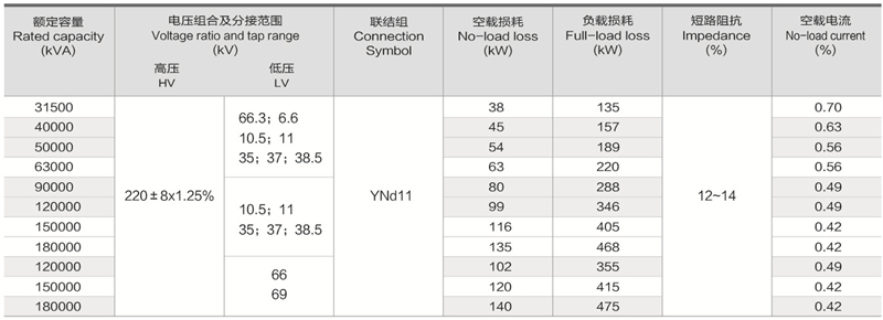 華信制造低壓為66kV級220kV雙繞組無勵磁調壓電力變壓器技術參數(shù):