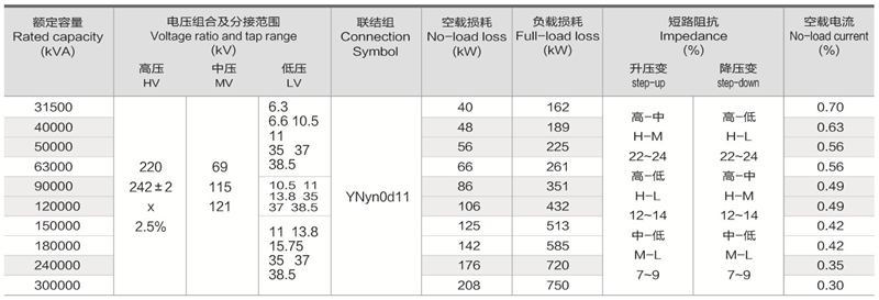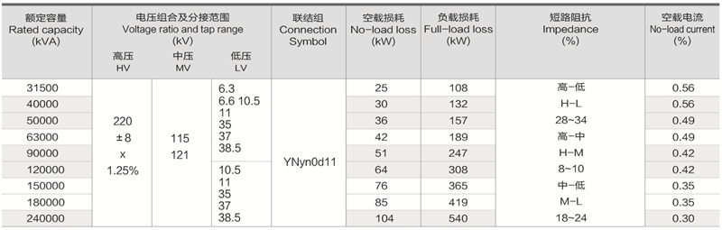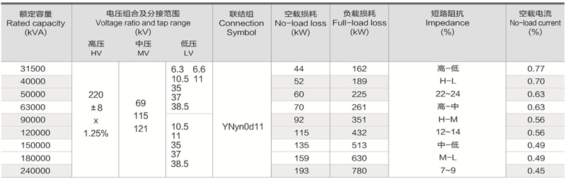 華信220kV三繞組無勵磁調壓自耦電力變壓器技術參數(shù):